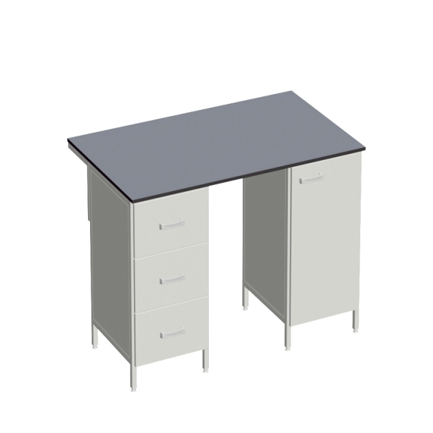 Лабораторный стол на опорных тумбах 1500х900х900 мм от компании «ЛАМО» – это надежное и функциональное решение для оборудования современных лабораторий. Стол состоит из прочной столешницы, установленной на металлические опорные тумбы. Левая тумба оборудована тремя выдвижными ящиками, а правая – дверкой и съёмной полкой. Ширина каждой тумбы составляет 500 мм. Задняя часть столешницы закреплена на Г-образном кронштейне, что обеспечивает дополнительную устойчивость и безопасность.