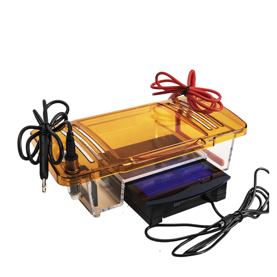 Осветитель синего света (трансиллюминатор) в комплекте позволяет в реальном времени отслеживать ход электрофореза. Подключается к источнику питания SPW-6S (приобретается отдельно).
