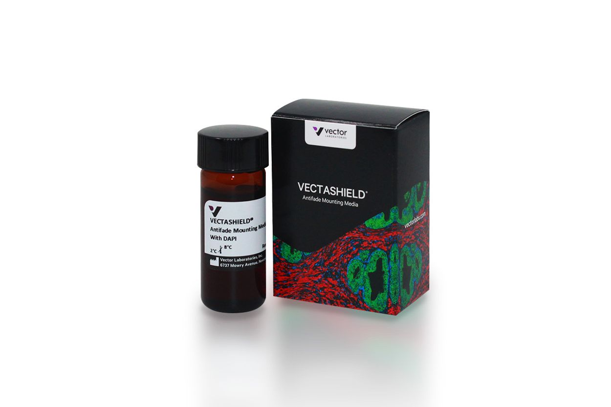 VECTASHIELD Antifade Mounting Medium с DAPI — это уникальная стабильная формула для сохранения флуоресценции. Эта среда ингибирует быстрое фотообесцвечивание флуоресцентных белков и флуоресцентных красителей. VECTASHIELD Mounting Medium с DAPI не затвердевает, а остается жидким на предметном стекле и может храниться без герметизации.
