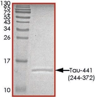 Recombinant human tag-free Tau-441 (244-372) was expressed in E. coli cells. Tau-441 or Tau-F is a member of the Tau family of proteins which function to stabilize the microtubules by binding to them. Tau proteins are subject to phosphorylation and this phenomenon regulates the association of the Tau protein with the microtubules (1). Deposits of Alzheimer′s disease AD-associated proteins, such as hyperphosphorylated Tau, as well as other shared misfolded proteins, such as, β-amyloid precursor protein (βAPP), ubiquitin, and various chaperones and protein kinases are thought to play a pathologic role in the cognitive decline and muscular failure. Malfunctioning of Tau proteins is associated with microtubules disintegration and collapsing of the neuronal transport system (2)._x000D_